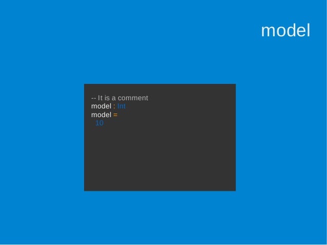 Counter. elm? debug. Код начинается с очень простой модели. Нам просто надо отслеживать одно число: При обновлении модели тоже всё очень просто. Мы определяем набор действий, которые могут выполняться и добавляем их обработку в функцию update: type. Action=Increment. Он просто описывает какие действия возможны. Если кому- то потребуется сделать чтобы счётчик удваивался, когда нажимается кнопка, то надо просто добавить новый конструктор в Action.